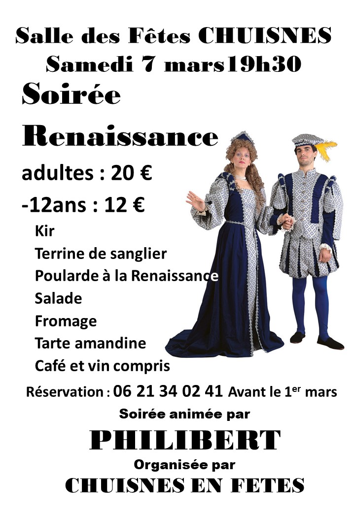 Notre association a organisé une soirée sur le thème "Renaissance" à la salle des fêtes de Chuisnes le samedi 7 mars.